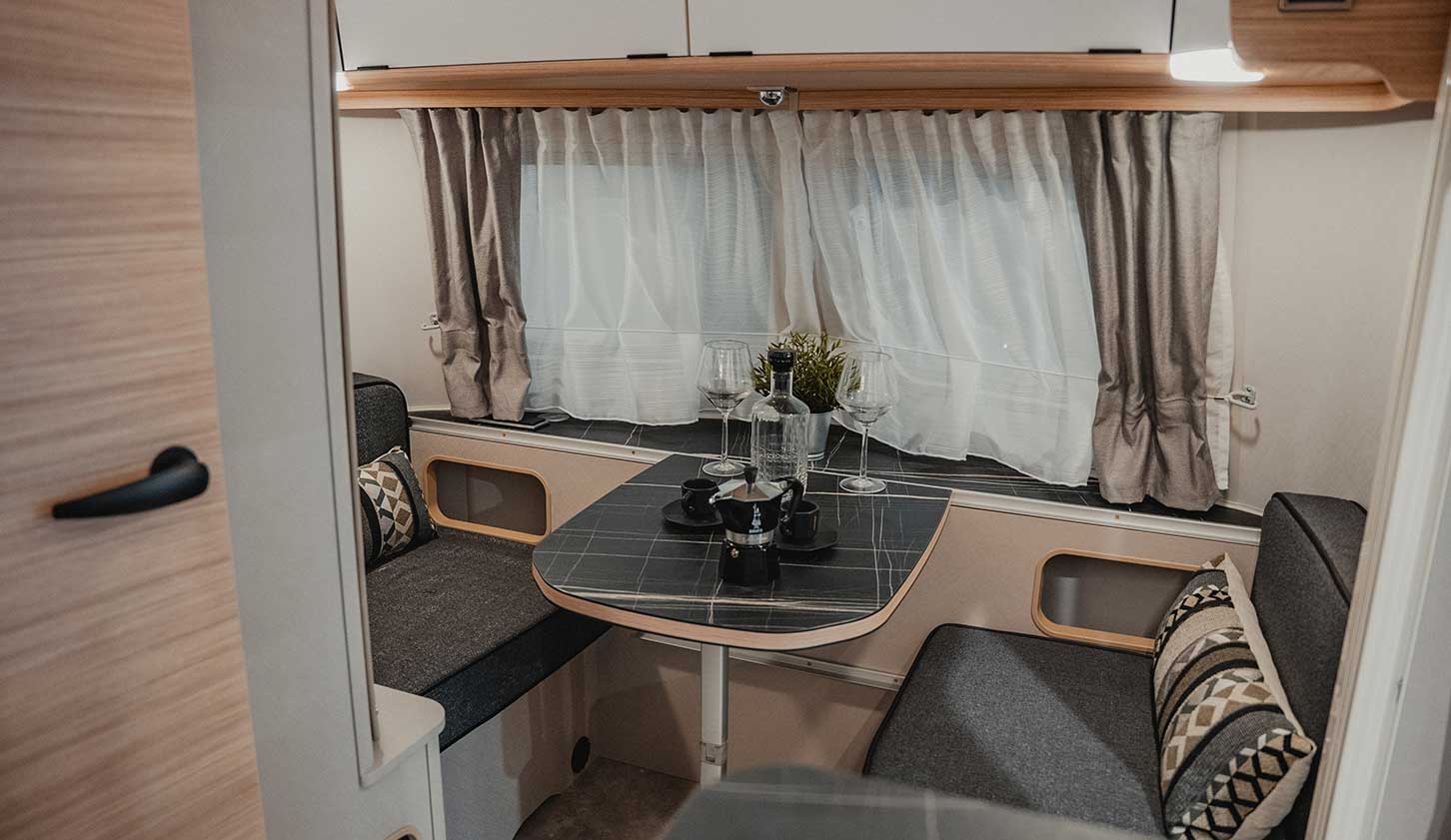 As standard within the caravan, you also get ambient lighting, “Tindari” furniture decor in a modern tone, as well as pleated blackout blinds and a sink cover that doubles up as a chopping board for convenience.