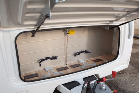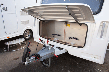 Outside, all the drains and steadies are easily reached. The Premium pack gives buyers a door flyscreen, hitch head stabiliser and smart alloy wheels. The one-piece front window is set into a ¾ height front panel and the front grab handles are recessed into it. The gas locker door is full-width and offers vast storage. The exterior door is a two-piece item. The sidewalls are single-piece aluminium and the rear panel is 1/3rd height. A high-level brake light is fitted. The controls for the water heater are tucked away on the front face of the offside bed box but the rest of the controls are handily located just inside the door on the right-hand side.